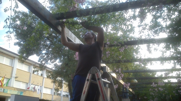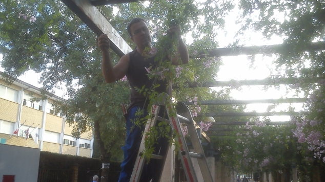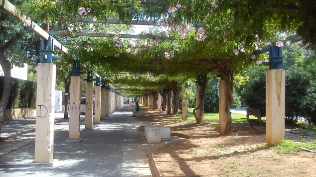 La fotografía se corresponde con la pérgola situada en la Avda. Blas Infante y que como se puede apreciar en la misma aparecen innumerables tallos colgantes que afean y mucho dando al conjunto un aspecto de cierto abandono. Como es fácil de adivinar se hace apremiante el arreglo de dicha pérgola a fin de recoger todos los tallos posibles que aparecen colgando para anudarlos con una cuerda a la parte superior de la pérgola con el propósito de que ésta luzca más tupida y, de esta manera, conseguir que a la larga la planta acabe por cubrir por completo el emparrillado de la parte superior de la pérgola.
